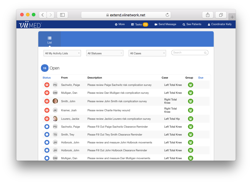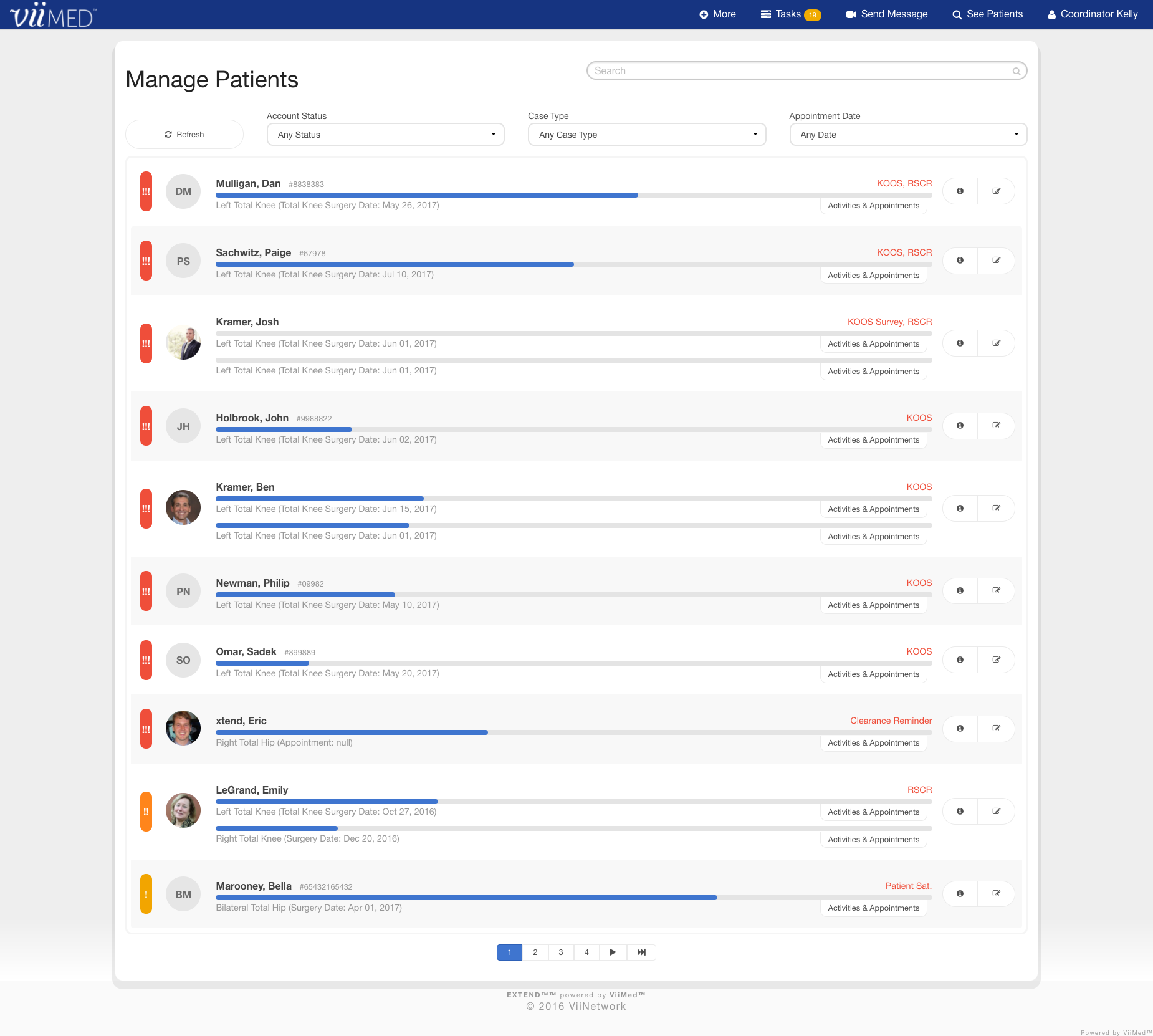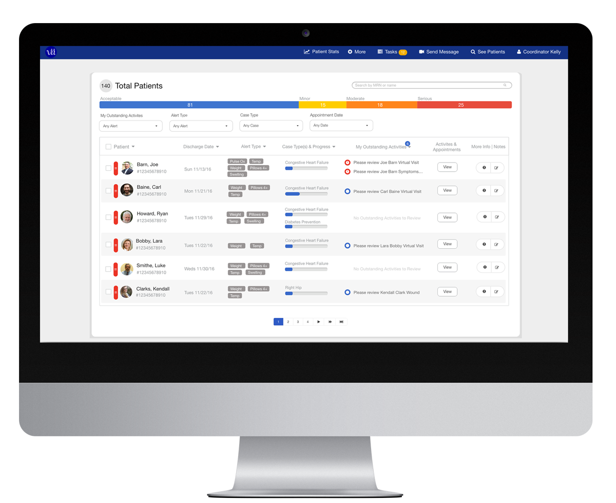 The existing ViiMed coordinator dashboard works very well for nurses who need to monitor patients throughout their orthopedic pathway. However, with congestive heart failure, it does not provide the high-risk alerts and prioritization needed to monitor patients who are more likely to be readmitted back to the hospital. It gives no insight at first glance when the patient’s discharge date was or what tasks the nurse or care coordinator need to complete in relation to each patient.