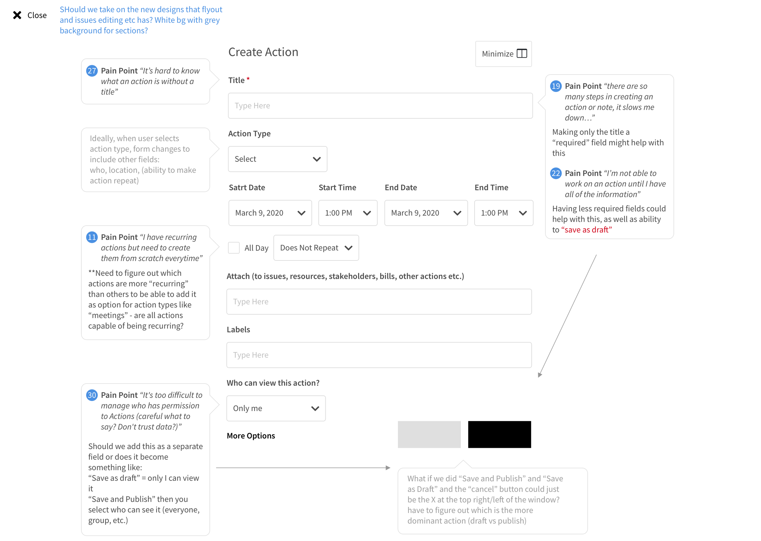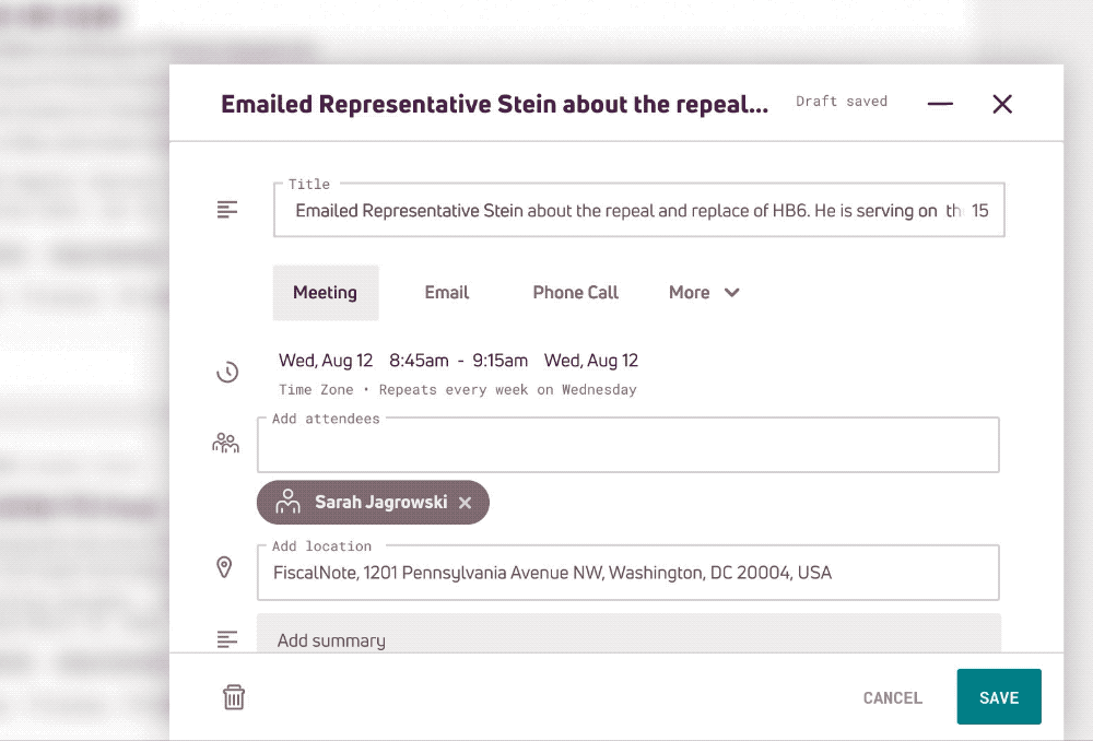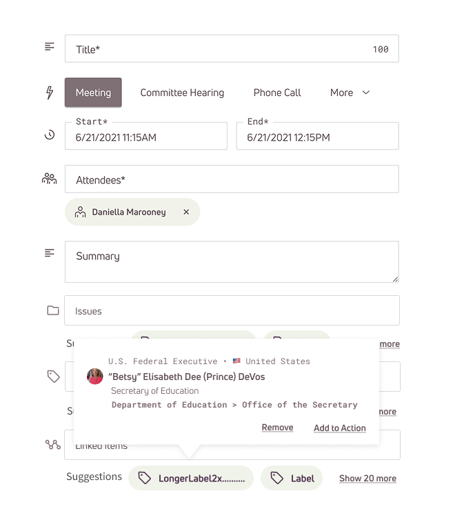 Scope: Core workflow for every government affairs activity (meetings, campaigns, legislative efforts). Success here meant success for the rest of the platform.